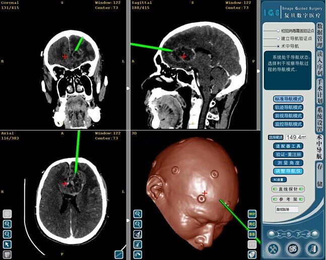 胶质瘤是脑组织的恶性肿瘤,病变部位与周围正常部位凭手术医生肉眼难以区别,导致手术时往往不能完整切除,所以,胶质瘤手术的最大问题是术后复发。神经导航系统利用影像显示,能够明显地区别病灶与周围组织的界限,指导手术医生进行病灶切除,显著减少术后复发率。