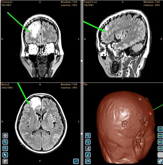 患者女性,胶质瘤术后放疗。近期头痛加重,磁共振示脑内多个异常信号区。为辨别手术切除范围,将ASL 的CBF图导入导航,以帮助判断组织类型